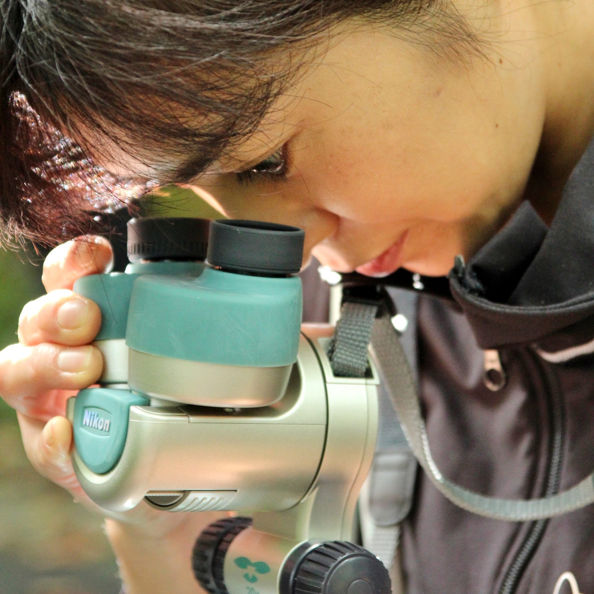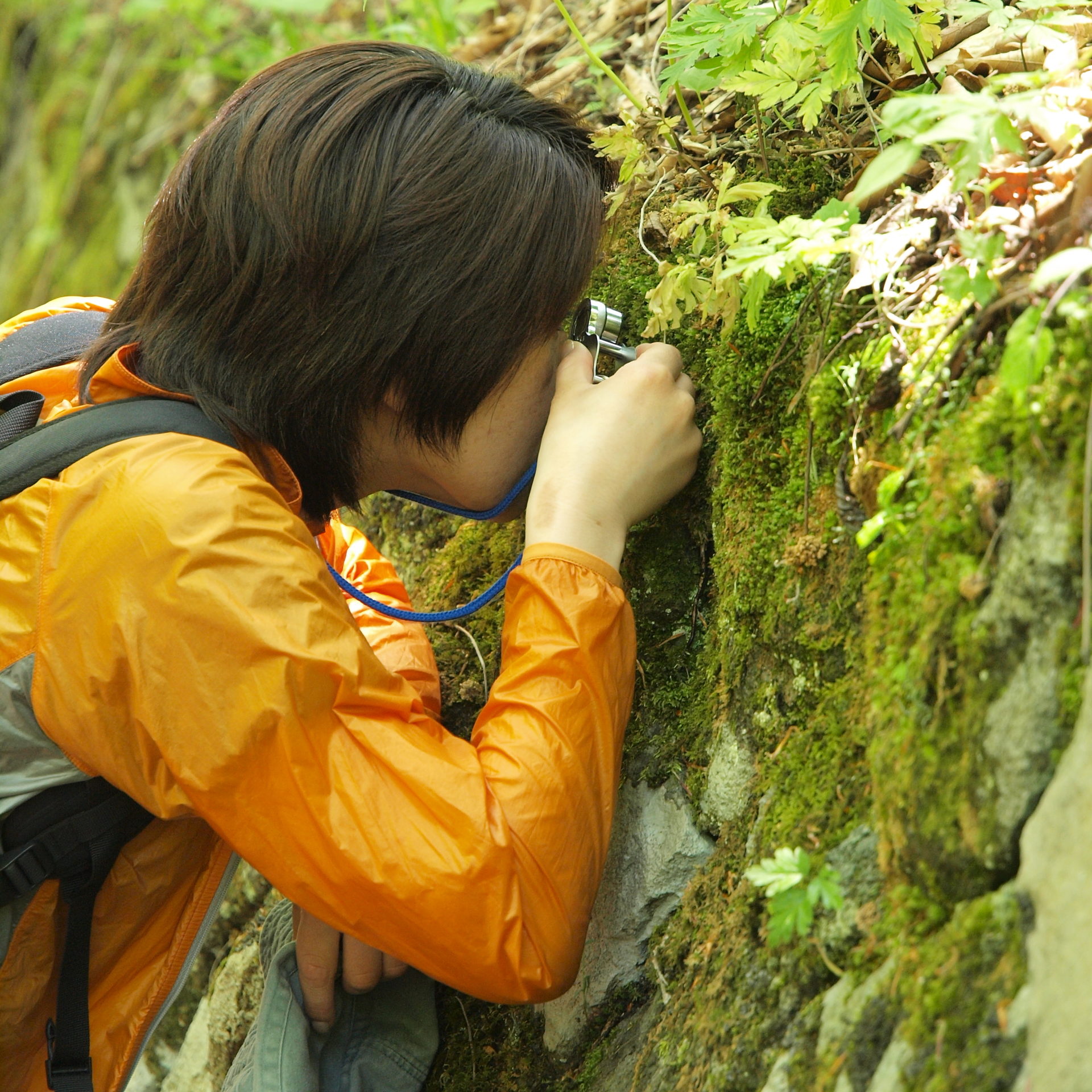 〈ルーペでコケを観察>