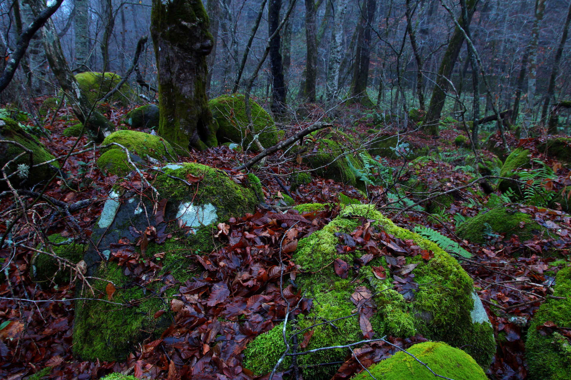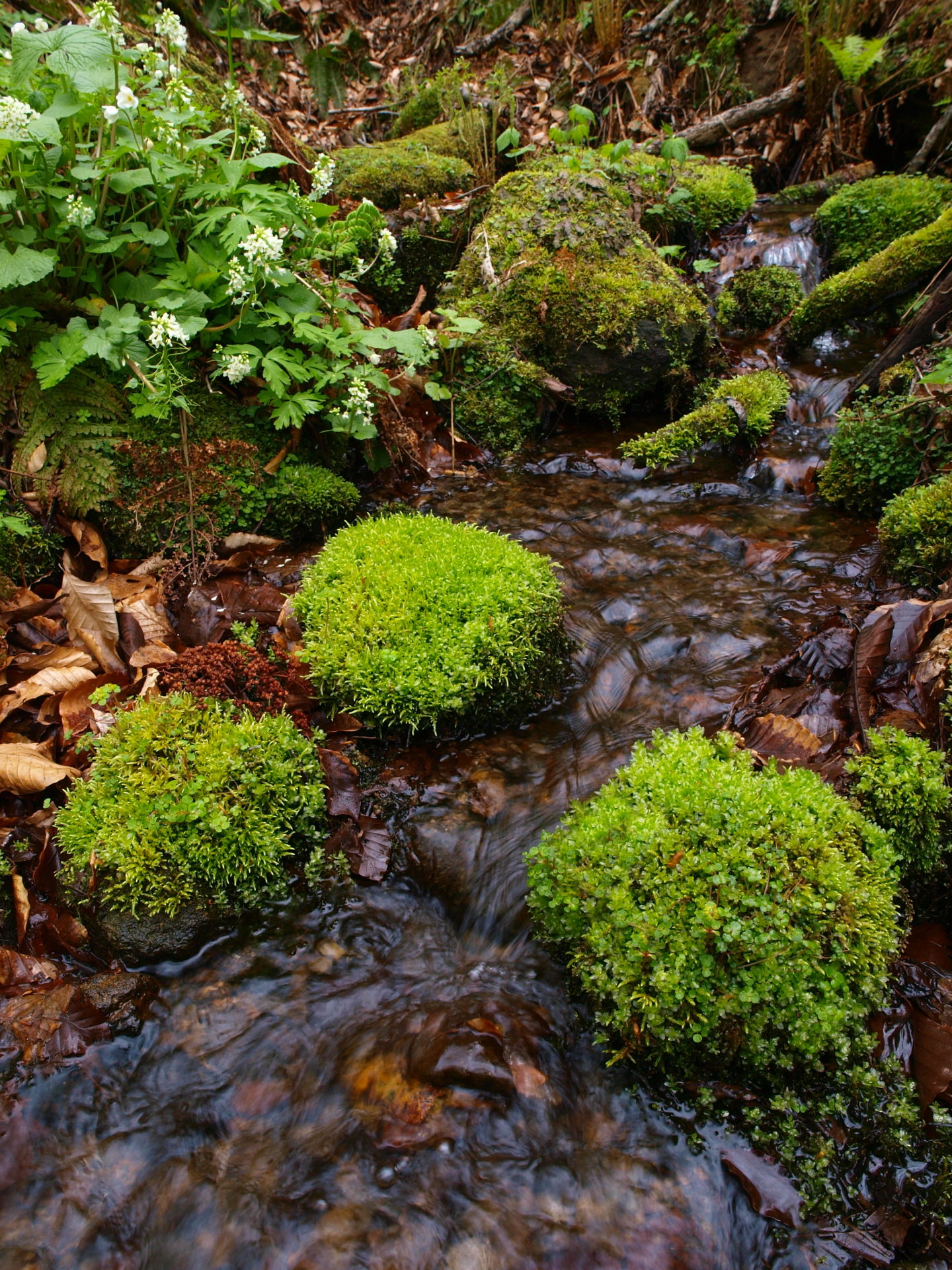 →安太へ向かう小為手山の真木(槙)の葉が、久しく見ぬうち苔むしていた